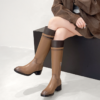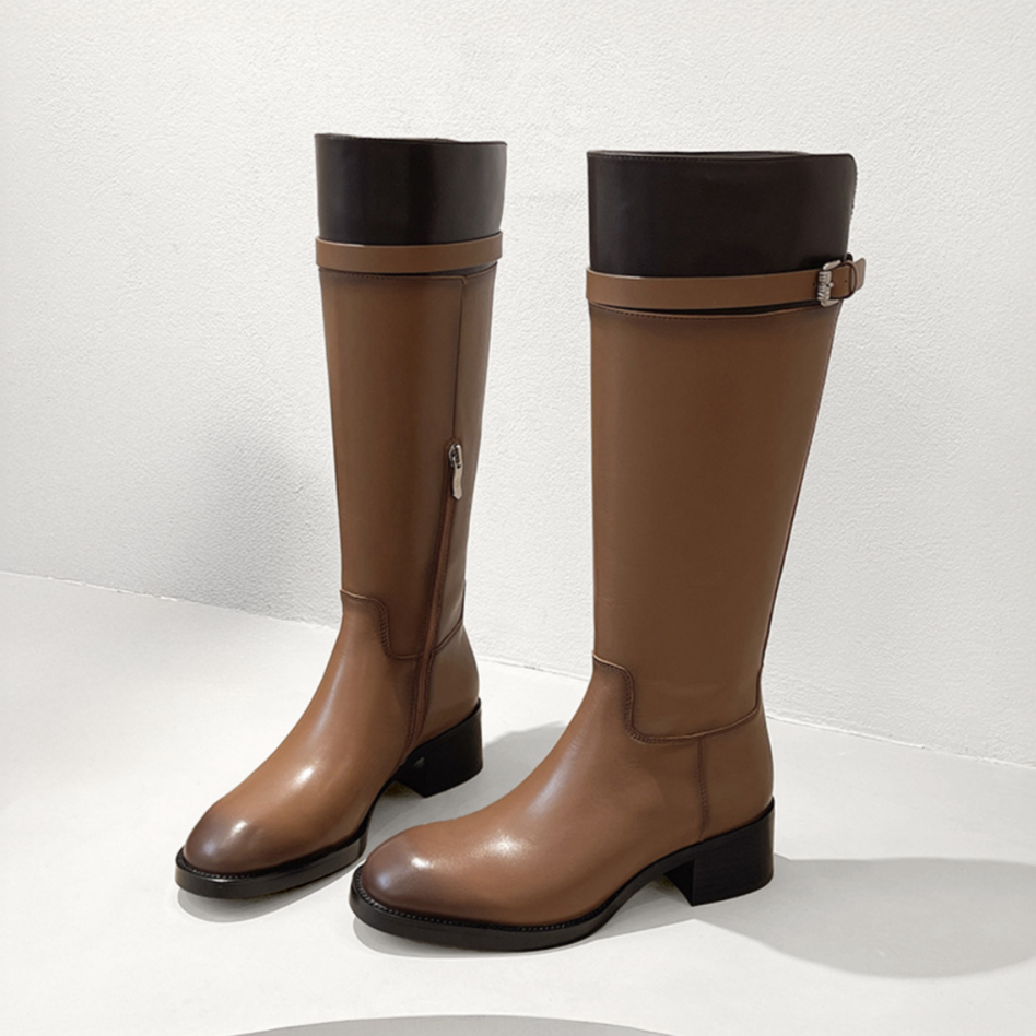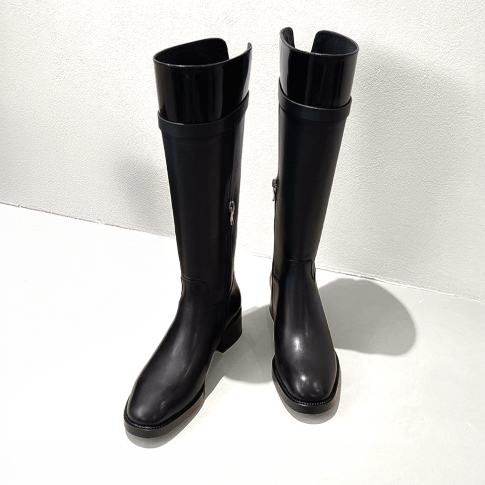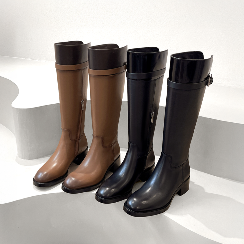 Thiết kế: Dáng ống cao ngang gối, form đứng mềm, giúp chân trông thon dài và thanh thoát. Chi tiết khóa kim loại nhỏ ở cổ bốt là điểm nhấn tinh tế, mang hơi hướng urban-chic.